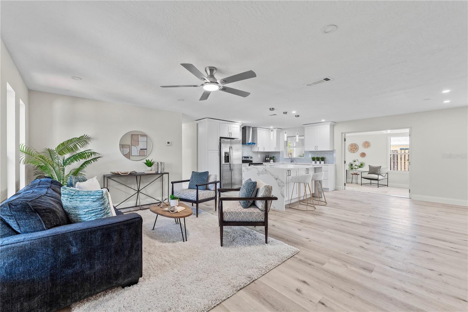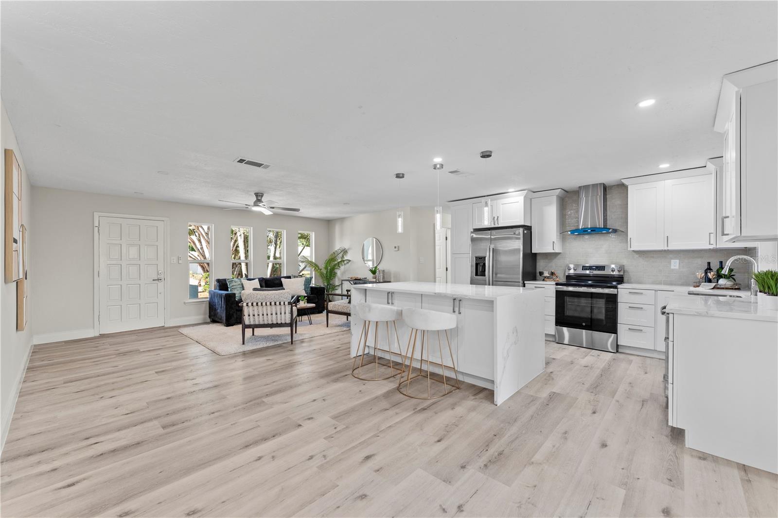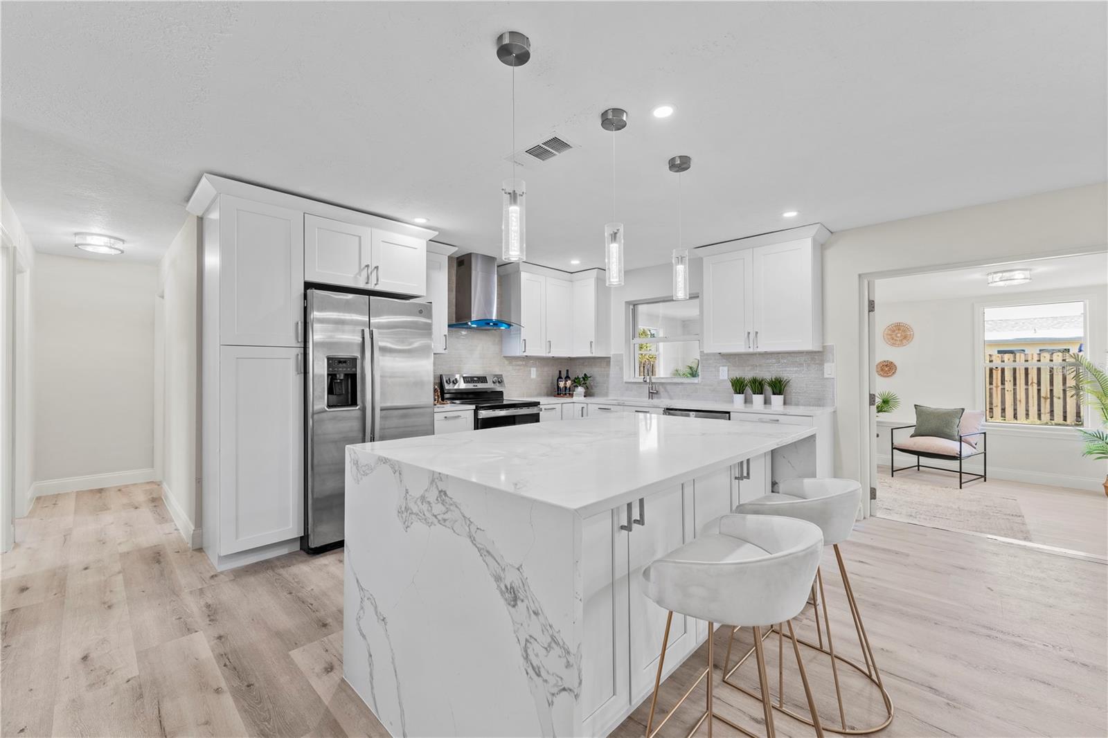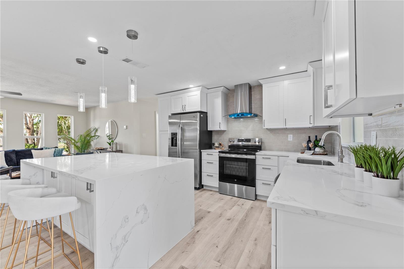 This beautifully renovated Indialantic home perfectly blends coastal charm with stylish, modern upgrades throughout. The open floor plan creates a bright, airy feel, anchored by luxury vinyl plank flooring and a brand-new kitchen that truly impresses. Designed for both function and beauty, the kitchen features stainless steel appliances, crisp white shaker cabinets, quartz countertops, a subway tile backsplash, and a stunning island with a gorgeous quartz waterfall. Both the master and guest bathrooms have been fully redesigned with tasteful tilework, updated vanities, and contemporary fixtures. The spacious primary suite includes a generous walk-in closet and a private bath with sleek finishes. A large flex space at the rear of the home offers versatility—perfect as a sunroom, home office, or playroom. Additional updates include a new HVAC system, new water heater, and fresh interior paint. The roof was replaced in 2019, offering peace of mind for years to come. Set just minutes from the beach, local dining, shopping, and top-rated schools, this turnkey property is a rare opportunity to enjoy modern coastal living in a highly sought-after location.