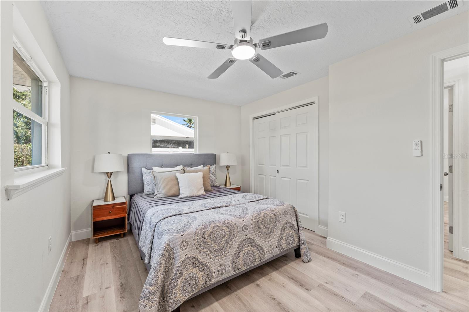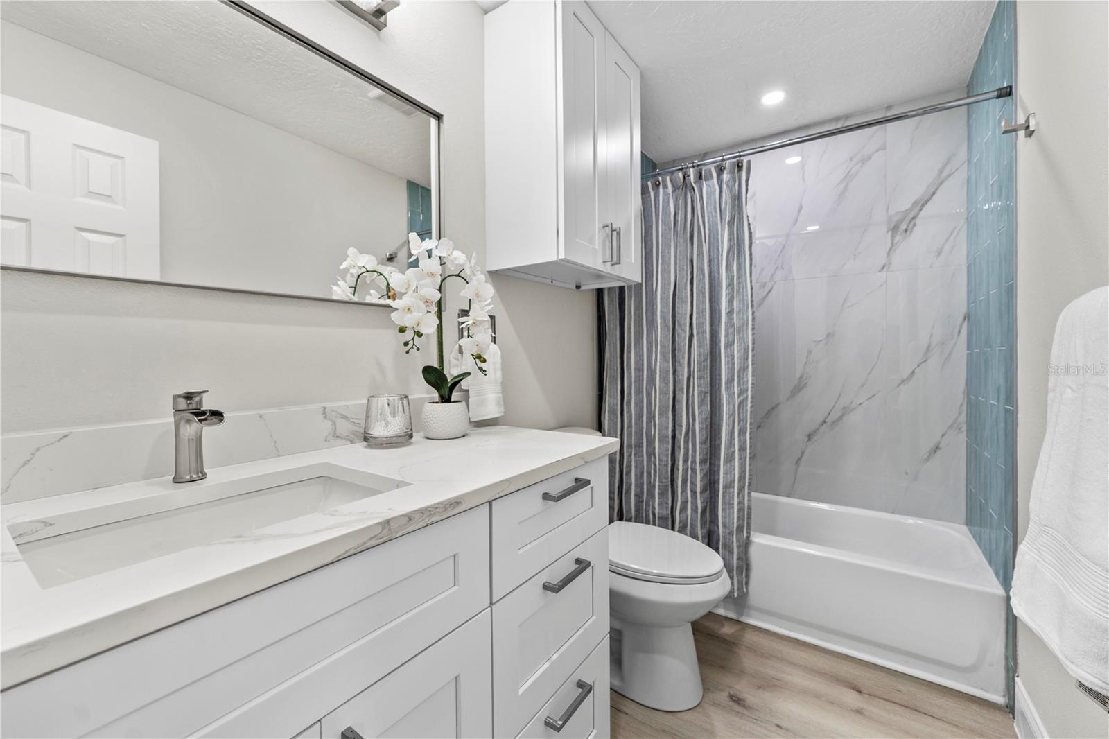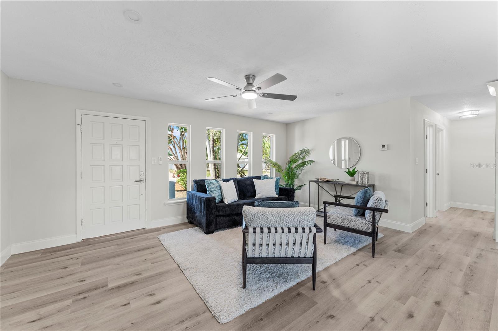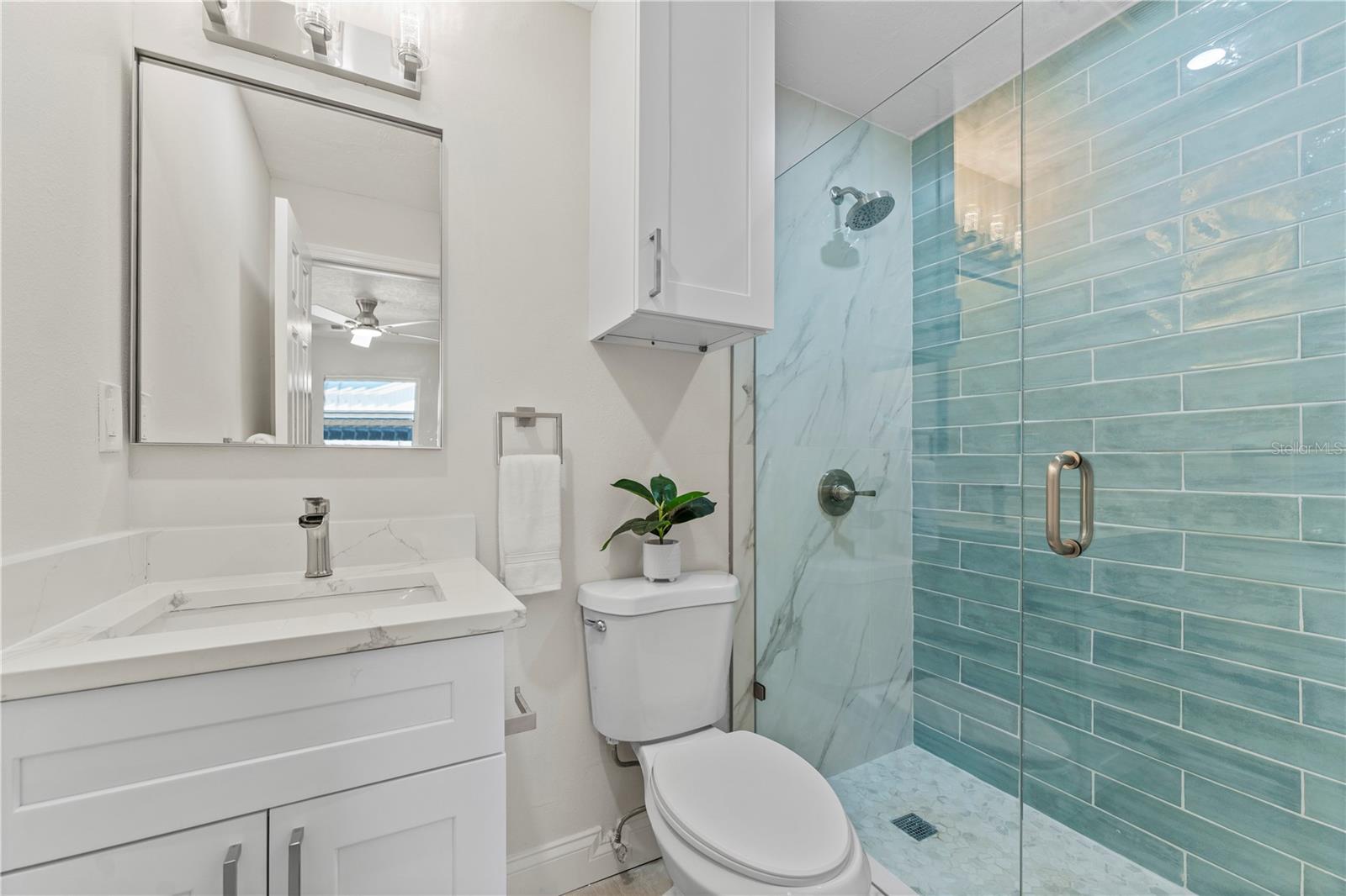 This beautifully renovated Indialantic home perfectly blends coastal charm with stylish, modern upgrades throughout. The open floor plan creates a bright, airy feel, anchored by luxury vinyl plank flooring and a brand-new kitchen that truly impresses. Designed for both function and beauty, the kitchen features stainless steel appliances, crisp white shaker cabinets, quartz countertops, a subway tile backsplash, and a stunning island with a gorgeous quartz waterfall. Both the master and guest bathrooms have been fully redesigned with tasteful tilework, updated vanities, and contemporary fixtures. The spacious primary suite includes a generous walk-in closet and a private bath with sleek finishes. A large flex space at the rear of the home offers versatility—perfect as a sunroom, home office, or playroom. Additional updates include a new HVAC system, new water heater, and fresh interior paint. The roof was replaced in 2019, offering peace of mind for years to come. Set just minutes from the beach, local dining, shopping, and top-rated schools, this turnkey property is a rare opportunity to enjoy modern coastal living in a highly sought-after location.